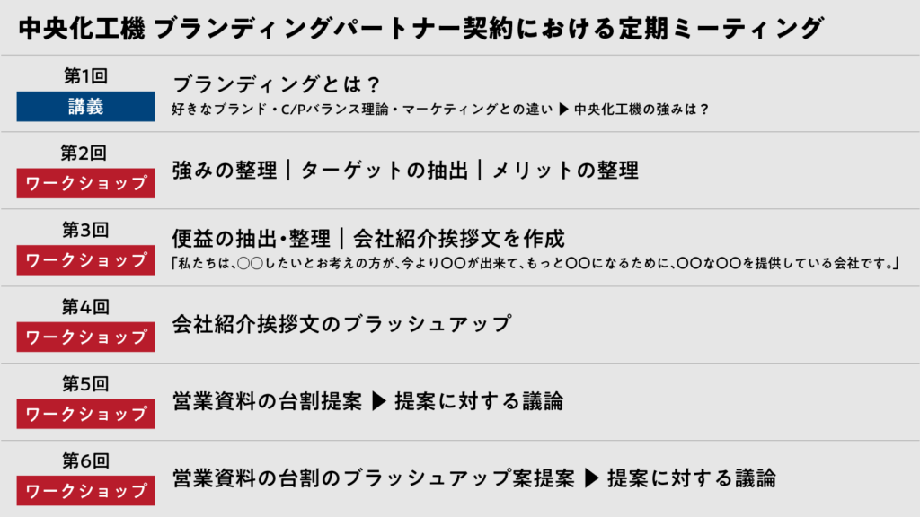 井戸田:初回はまず矢野からブランディングについての講義をおこない、2回目以降は、従業員のみなさんとともに、ブランディングの理解を高める時間を設けたり、中央化工機の強みを洗い出すワークショップを実施しました。