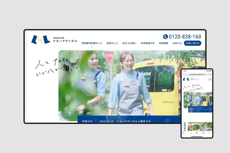 医師や歯科衛生士が施設や個人宅にうかがってケアをする「訪問歯科診療」を専門に手掛けている一般社団法人ヘルサ ナカハマデンタルさま。リブランディングを機に、オフィス内装、タグライン、ロゴ、ユニフォーム、パンフレット、ウェブサイトなど、幅広いプロジェクトを担当させていただきました。